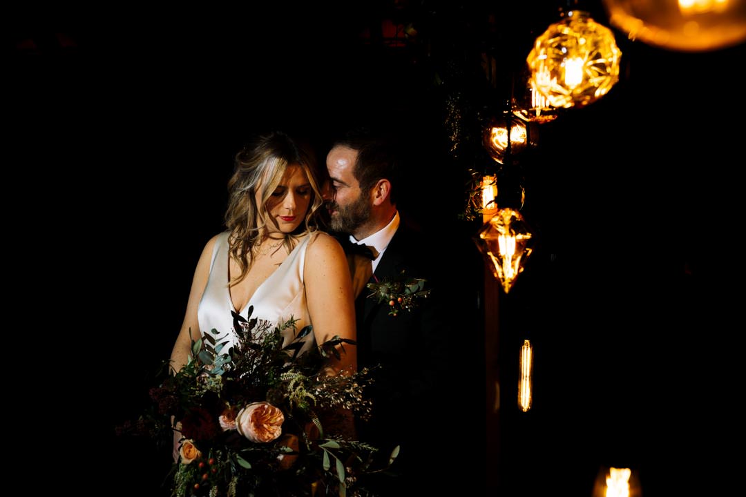 A couple shares an intimate moment in low light, surrounded by glowing decorative lights and a lush bridal bouquet.
