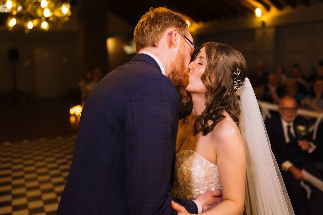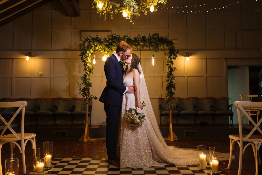 A bride and groom share a kiss under warm lighting, surrounded by greenery and candles, in a beautifully decorated ceremony room at Larkspur Lodge