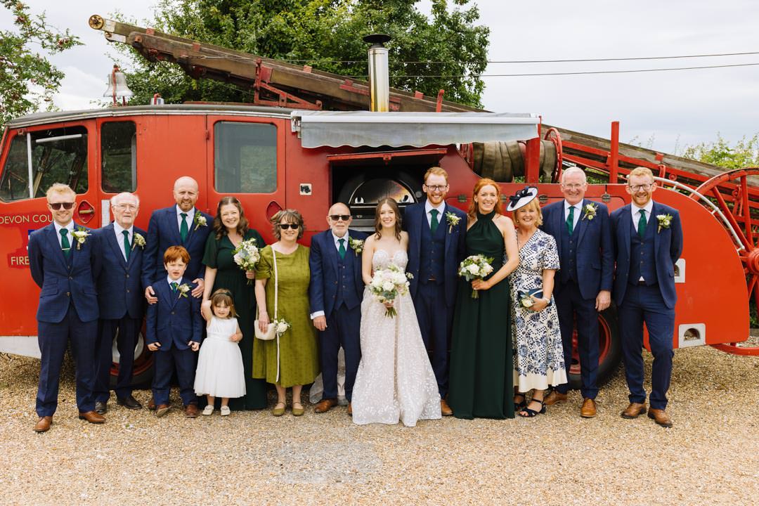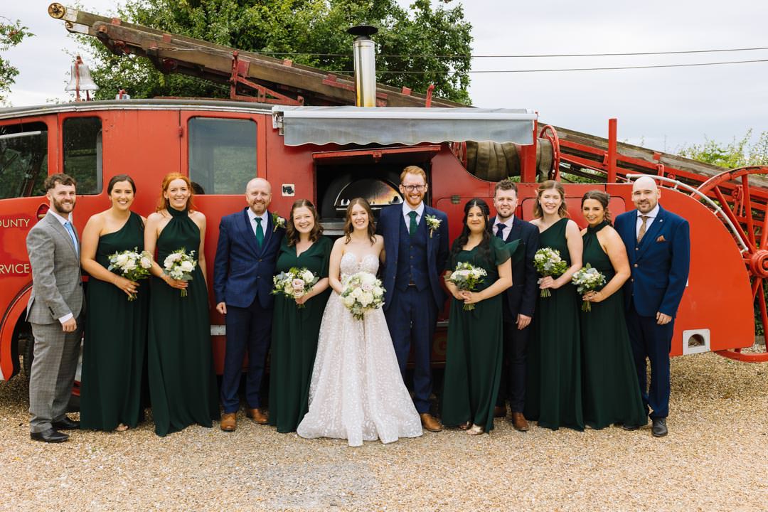 A bride and groom share a joyful moment in front of a classic red fire truck at Larkspur Lodge, showcasing a unique wedding theme.